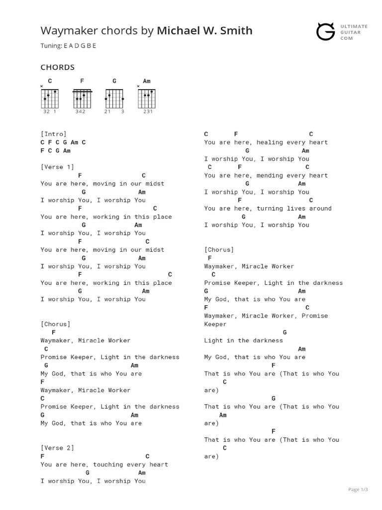 You are here You moving in our midst I worship You I worship You You are here You working in this place I worship You I worship You. Way maker Miracle worker Promise keeper Light in the darkness That is who you are Way maker Miracle worker Promise keeper Light in the darkness My God That is who you are You wipe away all tears You mend the broken heart You re the answer to it all Jesus You wipe away all tears You mend the broken heart You re the answer to it all to it all. We have an official Waymaker tab made by UG professional guitarists.